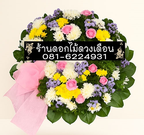 พวงหรีดดอกไม้สด โทนสีขาว-เหลือง-ชมพู-ม่วง มองแล้วสบายตา ประดับด้วยดอกเบญจมาศ ดอกมัม ดอกคาร์เนชั่นหรือดอกเยียบีร่า มีขนาดเส้นผ่านศูนย์กลางประมาณ 75 ซม.